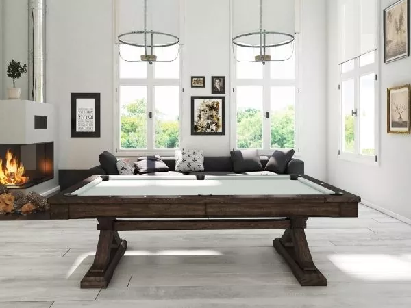 The Kariba billiard table is a weathered Kariba pool table made of solid wood with a dining tabletop option. This stylish transitional design is finished with an in-vogue charcoal brown finish.