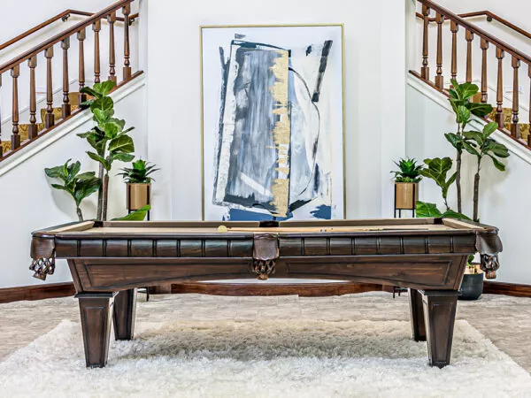 The Kruger billiard table is a traditional pool table with a beautiful, dark brown finish. The African wood is finished in a luxurious dark chocolate and has a choice of two leg styles: Tapered or Ball & Claw.